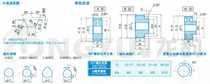 | 標準同步帶寬度 | K | W | G | L | L38齒~70齒 | L72齒以上 |