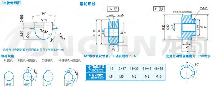| 規格 | 形狀 | 節徑P.D | 外徑O.D | 擋邊外徑F | 擋邊內徑M | 輪轂直徑Dm | 內孔dH7 | |||||