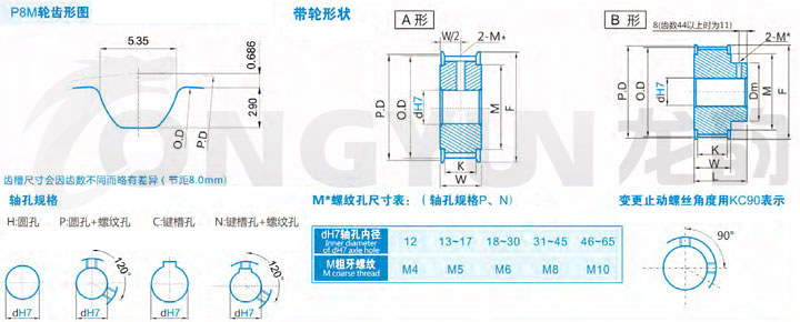 | 規格 | 形狀 | 節徑P.D | 外徑O.D | 擋邊外徑F | 擋邊內徑M | 輪轂直徑Dm | 內孔dH7 | ||||