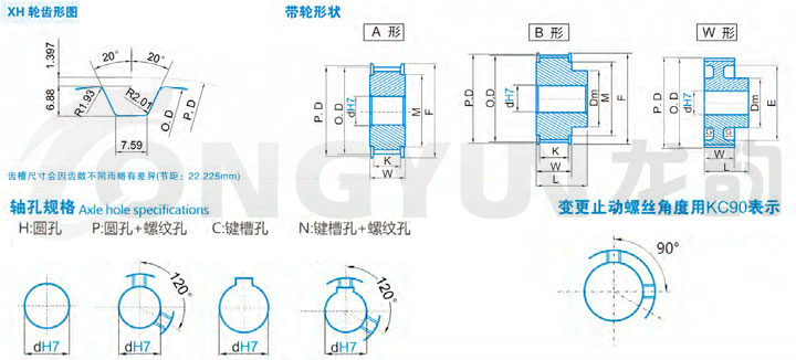 加工XH型同步帶輪所用材質以45#鋼、鋁合金為主、其它還可選用鑄鐵、銅、尼龍等其它適合加工的材料,如有需要也可以按照您所需的材料加工。XH型型同步帶輪表麵處理有本色氧化,發黑,鍍鋅,鍍彩鋅,高頻淬火等處理。精度等級依客戶要求而定。